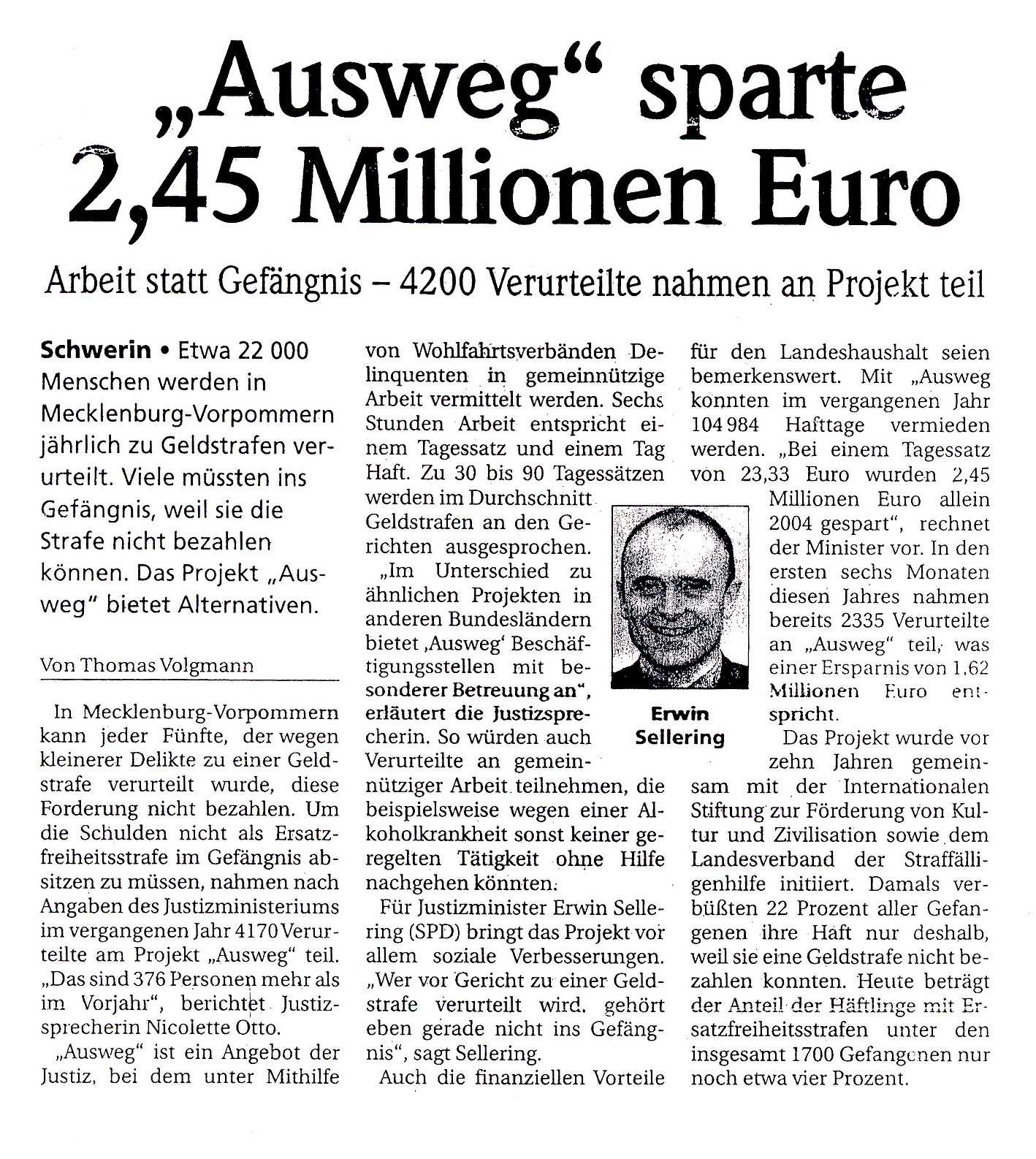 in Mecklenburg-Vorpommern allein im Jahre 2005 über 104.000 Hafttage durch gemeinnützige Arbeit abgeleistet und 2.45 Millionen Euro Steuergelder eingespart (Schweriner Volkszeitung 22.10.05).