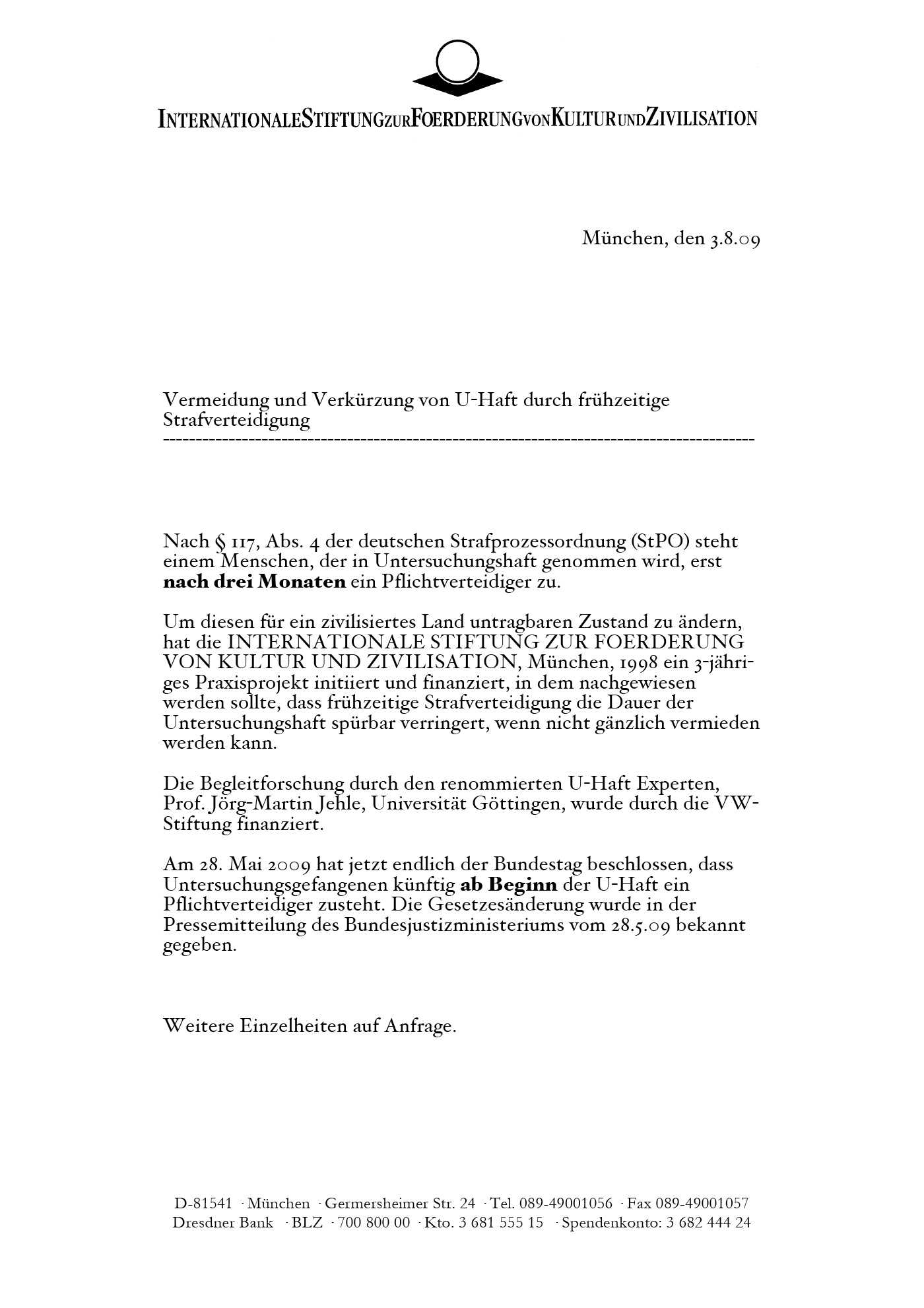 und Bayern, sowie der VW-Stiftung drei groß angelegte, kostspielige Modellprojekte zur Vermeidung von Haftstrafen für Bagatelldelikte und U-Haft durchgeführt. Nach langen Bemühungen hat die Bundesregierung im Jahre 2004 einen Gesetzentwurf zur Neufassung von