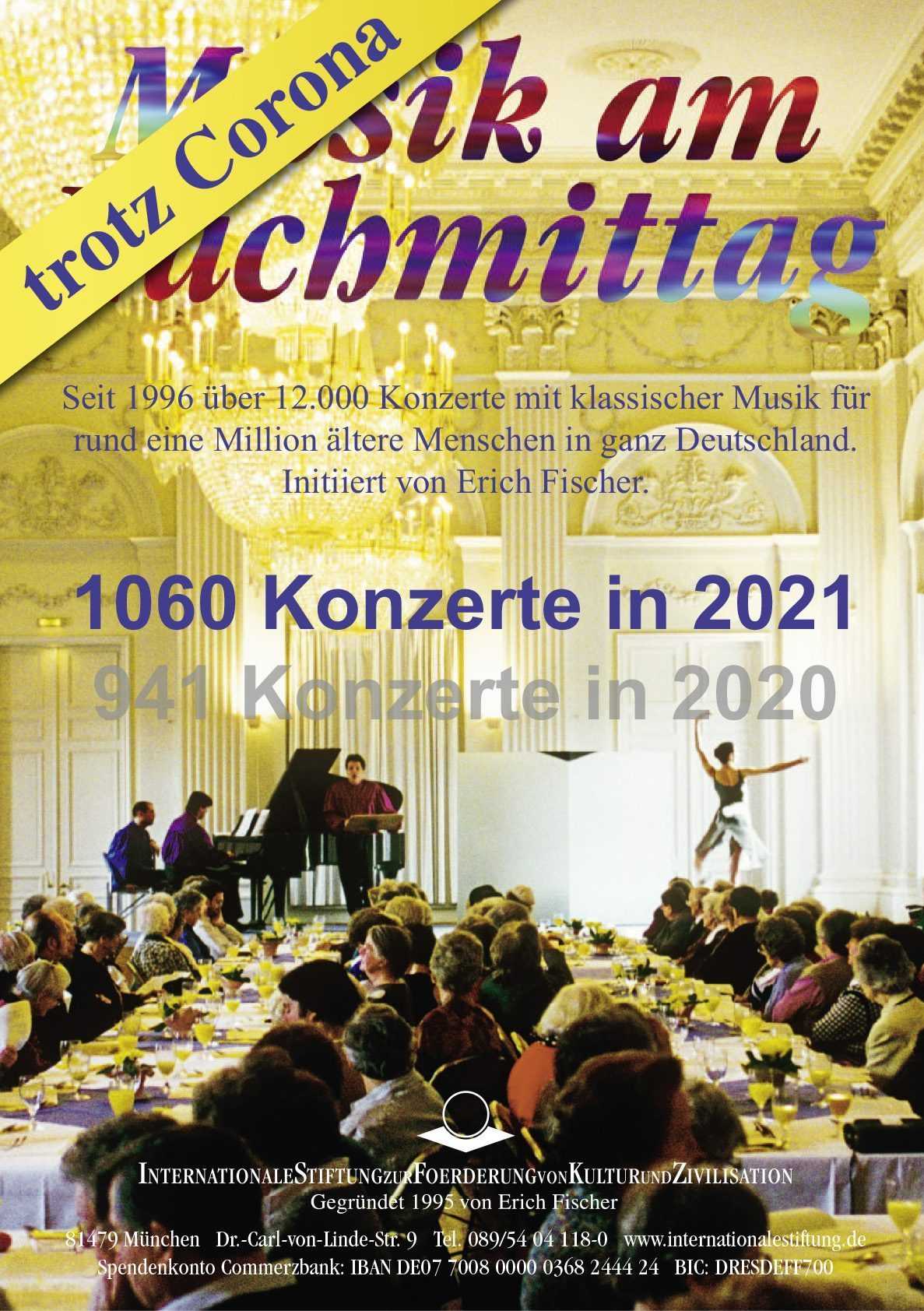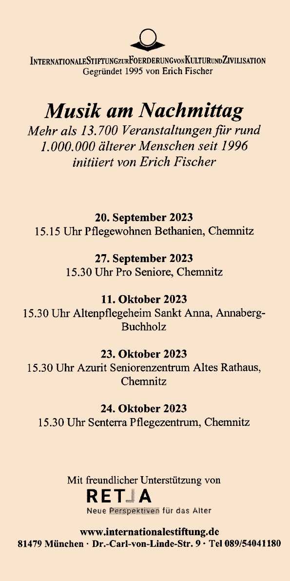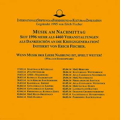 Seit 1996 über 16.100 stimmungsvolle live Konzerte mit klassischer Musik bis 07/2025 für über 1.134.000 begeisterte ältere Menschen. Initiiert und finanziert vom Stifter Erich Fischer als ein besonderes Dankeschön an die Kriegs- und Nachkriegsgenerationen. In festlichen Sälen bei Kaffee und Kuchen oder direkt in Alten- und Pflegeheimen.