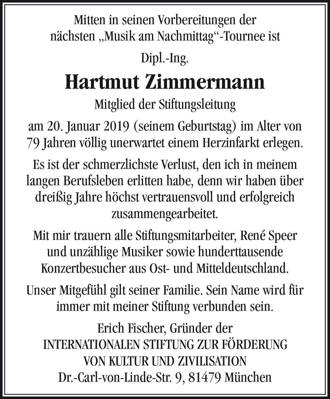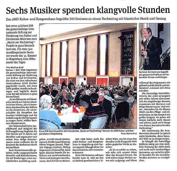Ein besonderer Schwerpunkt der Aktivitäten sollte nach dem Willen des Stifters als Beitrag zur Wiedervereinigung in Ost- und Mitteldeutschland liegen. Hier hat das Ehepaar Helga und Hartmut Zimmermann im Auftrag der Stiftung von 1997 bis zu seinem Tod († 2018 / † 2019) nach mühevoller Aufbauarbeit weit über 1.200 Musiknachmittage in festlichen Sälen für hunderttausende begeisterte Senioren organisiert.