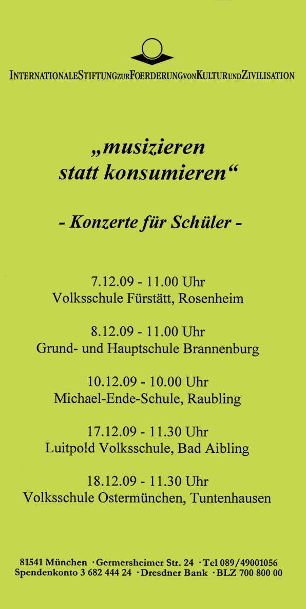Ein weiterer sehr bedeutender Schritt auf dem Wege zu „Musizieren statt Konsumieren“ besteht seit 2009 darin, Live-Konzerte vorwiegend in Schulen auf dem Lande zu veranstalten, um die Schüler mit dem hohen Kulturgut der klassischen Musik und des Musizierens bekannt zu machen. Unter der Leitung von Johannes Erkes (Musikdirektor) und