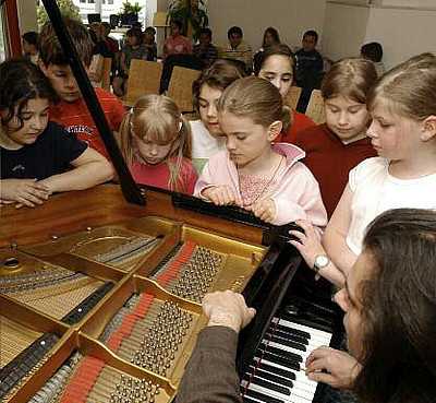 Im Unterschied zu mancherlei Versuchen, jungen Menschen mehr oder weniger en passant ein Musikinstrument in die Hand zu drücken, wissen wir, daß umfassende, andauernde Bemühungen von qualifizierten Lehrern und ein positiv gestimmtes Umfeld unentbehrlich sind. Das Klavier als Schwerpunktinstrument wurde mit Bedacht gewählt, weil es nicht nur das perfekteste allround Instrument ist sondern auch, im Gegensatz zu weitverbreiteten Fehleinschätzungen, für durchschnittlich begabte Schüler geeignet ist. Während es beispielsweise bei der Geige – Hochbegabte ausgenommen – im allgemeinen Jahre intensiven Übens bedarf, bis halbwegs hörbare Töne herauskommen (wer verfügt schon über so viel Ausdauer?), kann der Klavierschüler bereits nach wenigen Monaten "Musik machen", weil er sich nicht um Tonbildung usw. kümmern muß. Darüberhinaus ist der Klavierspieler nicht auf andere Mitspieler angewiesen sondern verfügt völlig autonom über ein schier unerschöpfliches Solo-Repertoire jeglichen Schwierigkeitsgrades und Genres.